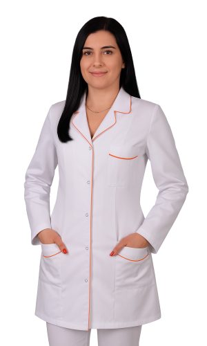 Fartuch medyczny Alicja kolor biały , wykonany jest z wysokogatunkowej tkaniny medycznej wyprodukowanej specjalnie dla naszej firmy. Ten oddychający materiał zachowuje swój kształt w każdych warunkach i na każdej figurze. Krój doskonale podkreśla sylwetkę.