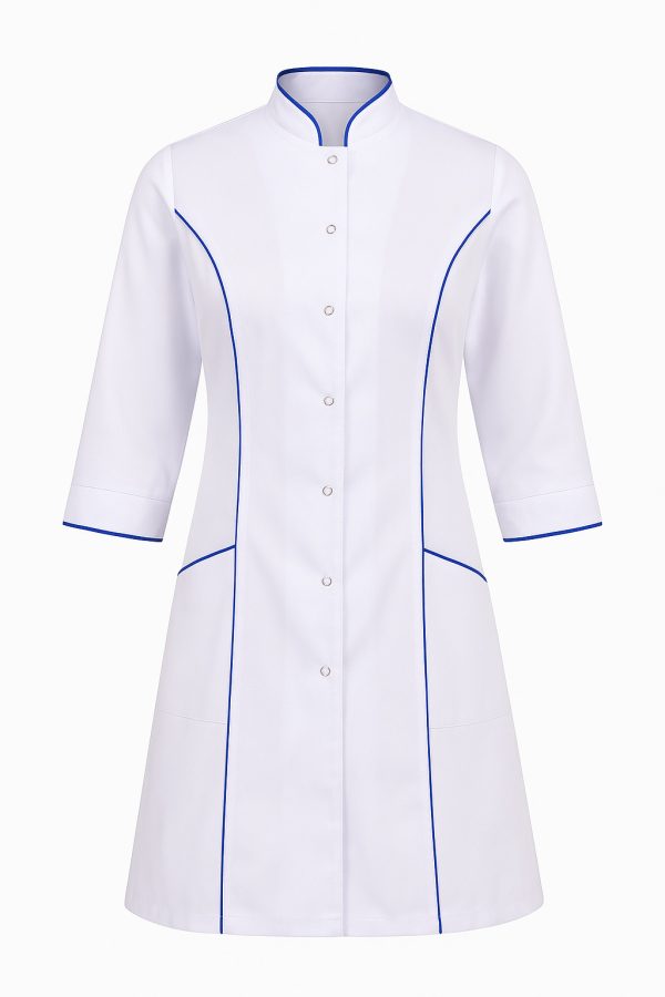 Uniform wyróżnia się pionowymi cięciami francuskimi, które optycznie wysmuklają sylwetkę i podkreślają talię. Kontrastowa lamówka dodaje całości charakteru, a stójkowy kołnierzyk nadaje elegancki wygląd, idealny zarówno do pracy w szpitalu, przychodni, jak i w gabinecie kosmetycznym.